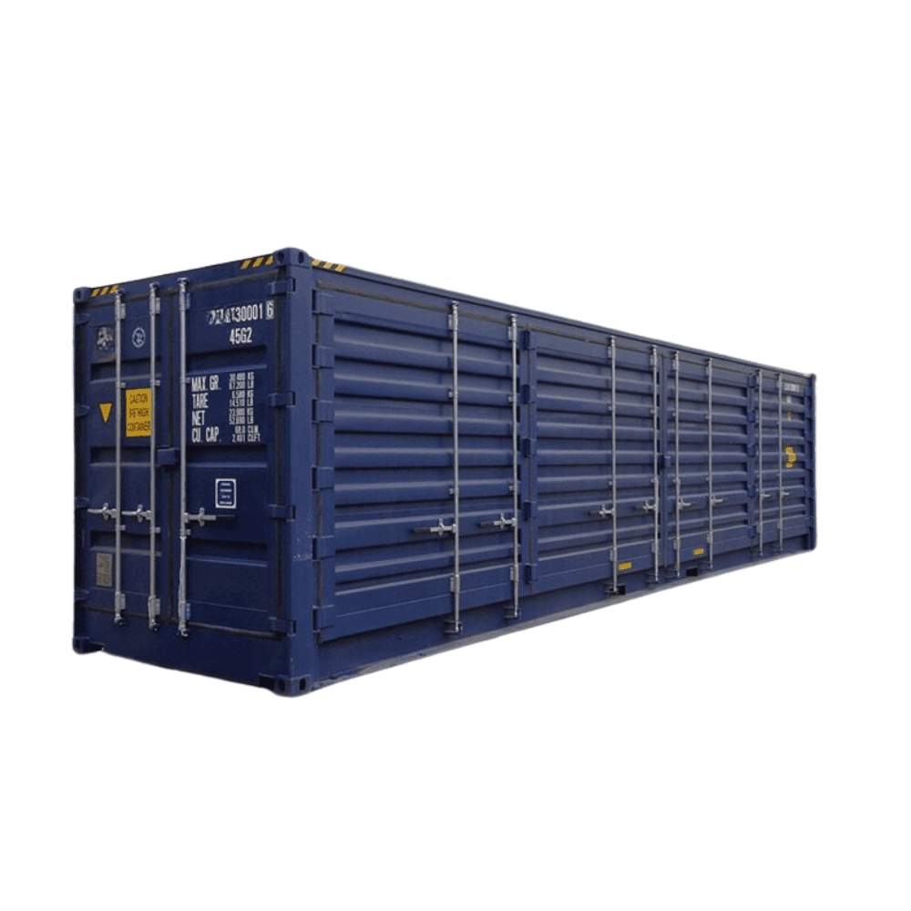 En 40 fot high cube open side container med smidig åtkomst från både kortsida och långsida.